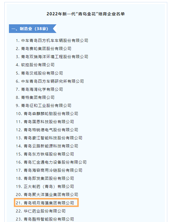 明月海藻集團連續四年榮獲新一代“青島金花”培育企業