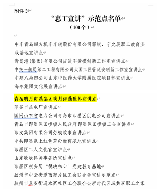據(jù)了解,為深入貫徹落實(shí)習(xí)近平新時(shí)代中國(guó)特色社會(huì)主義思想,貫徹習(xí)近平總書記關(guān)于工人階級(jí)和工會(huì)工作的重要論述,加強(qiáng)和改進(jìn)新時(shí)代職工思想政治引領(lǐng)工作,自2022年以來(lái),青島市各級(jí)工會(huì)聚焦迎接、學(xué)習(xí)、宣傳黨的二十大,廣泛搭建提升職工思想道德文化素質(zhì)的學(xué)習(xí)實(shí)踐平臺(tái),不斷提高職工思想政治工作科學(xué)化規(guī)范化制度化水平,增強(qiáng)工作針對(duì)性實(shí)效性,現(xiàn)共從全青島市范圍內(nèi)評(píng)選出10個(gè)職工思想政治教育實(shí)踐基地、100個(gè)“惠工宣講”示范點(diǎn),我集團(tuán)的“明月海藻世界”和“明月海藻世界宣講點(diǎn)”以絕對(duì)優(yōu)勢(shì)分別榮獲這兩項(xiàng)殊榮。