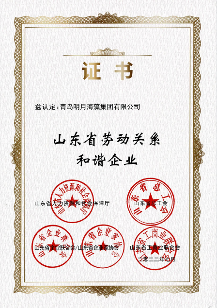 明月海藻集團榮獲“山東省勞動關系和諧企業”稱號