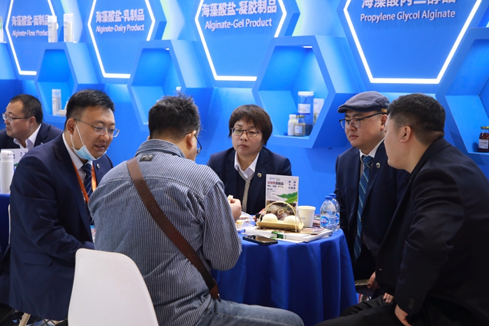 在此次FIC2024展會上,明月海藻集團憑借其時尚大氣的開放式展臺設計,在眾多參展商中脫穎而出。展臺以海洋藍色為主調,不僅彰顯了公司源于海洋的深厚底蘊,更展示了其對于環保、健康的執著追求。