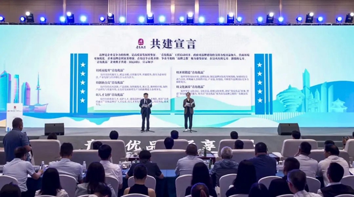 會上,優秀企業代表們共同上臺領取《“青島優品”形象標識授權書》,并進行了莊重的青島優品“企業攜手共建·同心同行”宣誓儀式。