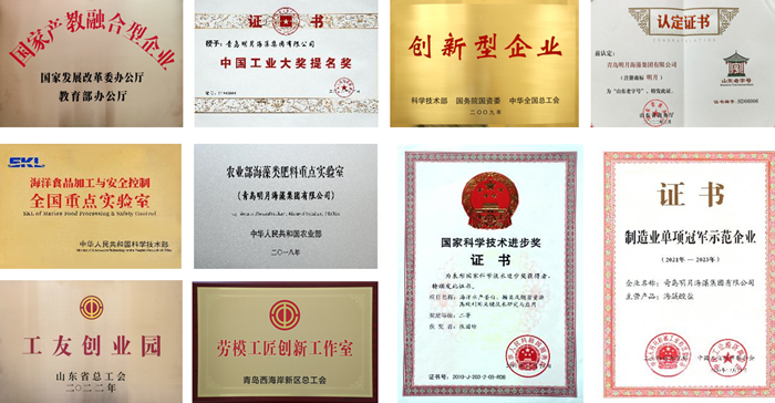 近年來,青島明月海藻集團大力實施創新驅動發展戰略,持續塑強核心優勢,創新已成為明月海藻激活高質量發展的“新引擎”。企業先后榮獲國家科技進步二等獎、國家創新型企業、國家產教融合型企業、國家制造業單項冠軍、中國工業大獎提名獎、中國營養科學技術獎、國家工業旅游示范基地、山東省海洋產業領軍企業、山東老字號、“好品山東”制造業企業、省級工友創業園等稱號,并獲批建設了海洋食品加工與安全控制、海藻類肥料兩個國家級重點實驗室。